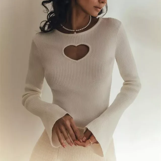 Introducing a must-have addition to your autumn and winter wardrobe: a beautifully designed sweater that blends sophistication with comfort. Crafted from high-quality viscose, this slim-fit pullover features a unique heart knit pattern with an eye-catching hollow-out design. The round neck and flare sleeves add a touch of elegance, making it perfect for the office lady who seeks style without compromising on comfort.